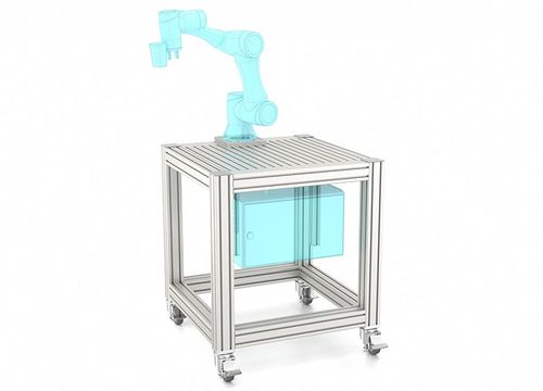 Its high degree of flexibility makes this workstation the perfectly organised basis for cutting-edge production, simplifying the development of new production methods. The full-size item Groove Plate offers a universal fastening option for fixtures, the cobot and other accessories. Cable conduits integrated into the Profiles XMS route cables safely. The cleanly closed outer surfaces and doors turn the load-bearing frame into a generously sized under-bench cabinet with storage space for technology and working materials.